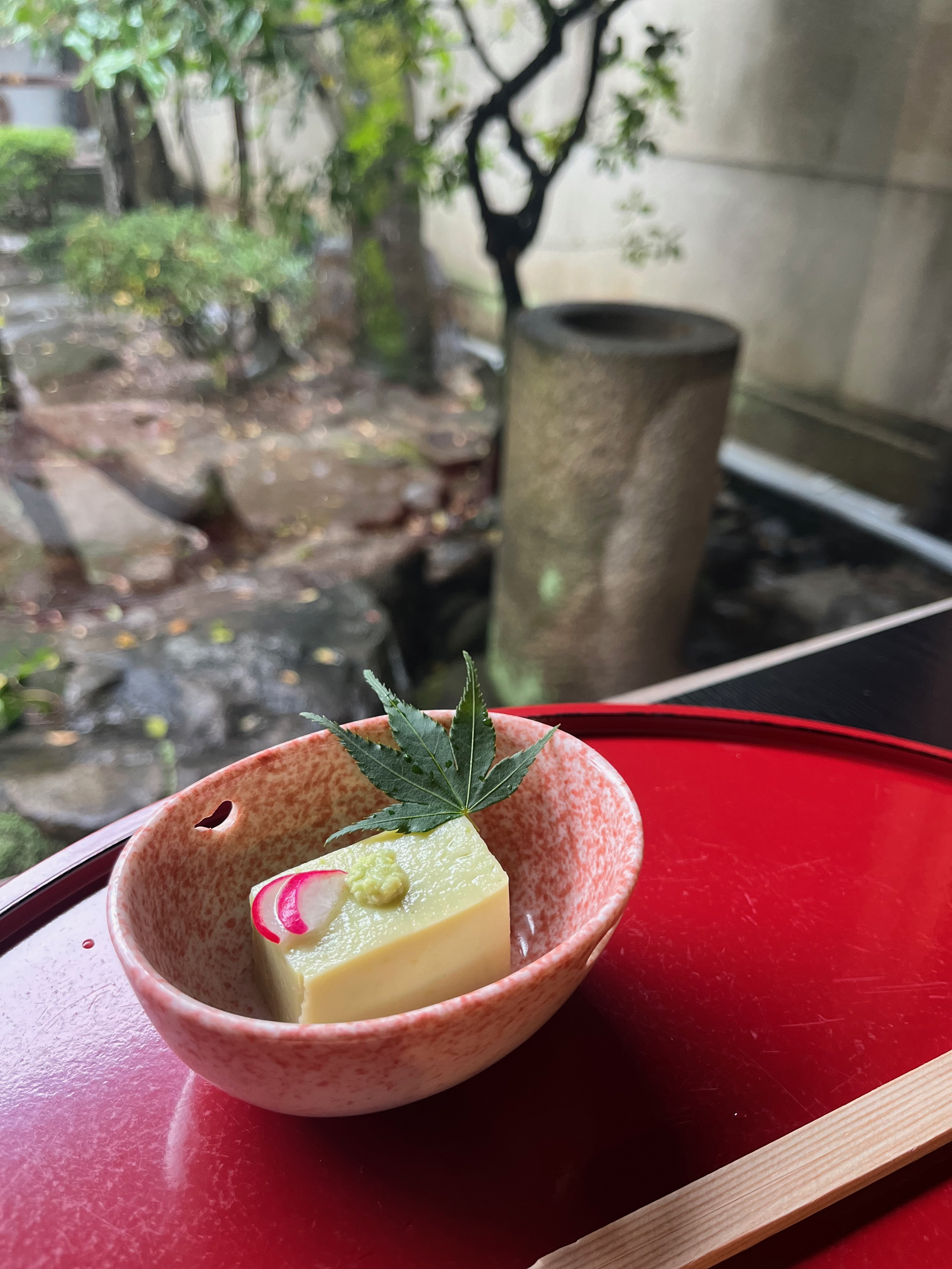 今月の先附、季節の胡麻豆腐はそら豆のお豆腐。やわらかな甘みと、ほのかな青い香り。「大和豆」とも呼ばれるそら豆は、奈良ゆかりの味わいです。奈良町でランチをお探しの際は、季節の一品とともにお楽しみください。